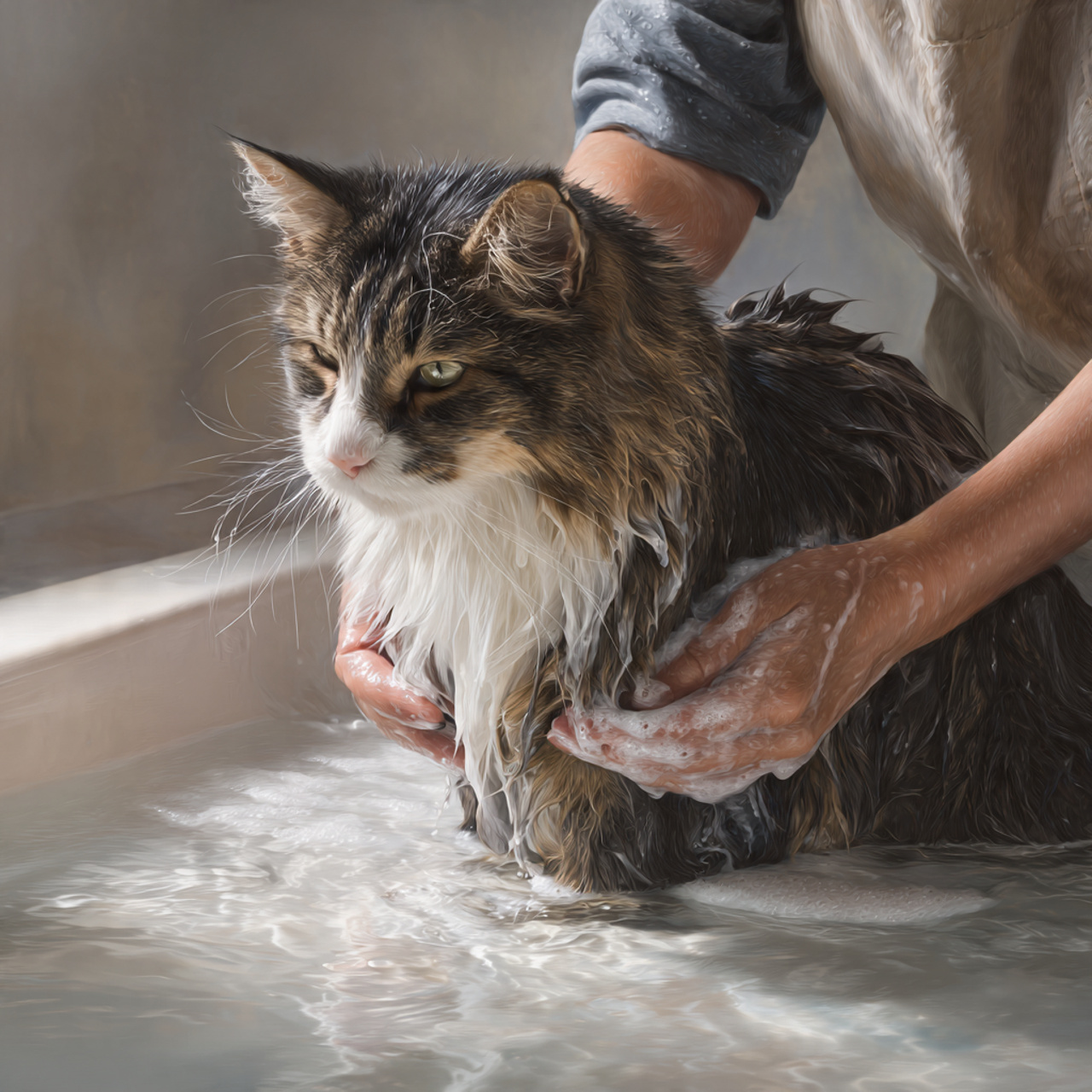 Long-haired cats may benefit from occasional baths, especially if oils build up in their fur. Baths should always be gentle and infrequent.